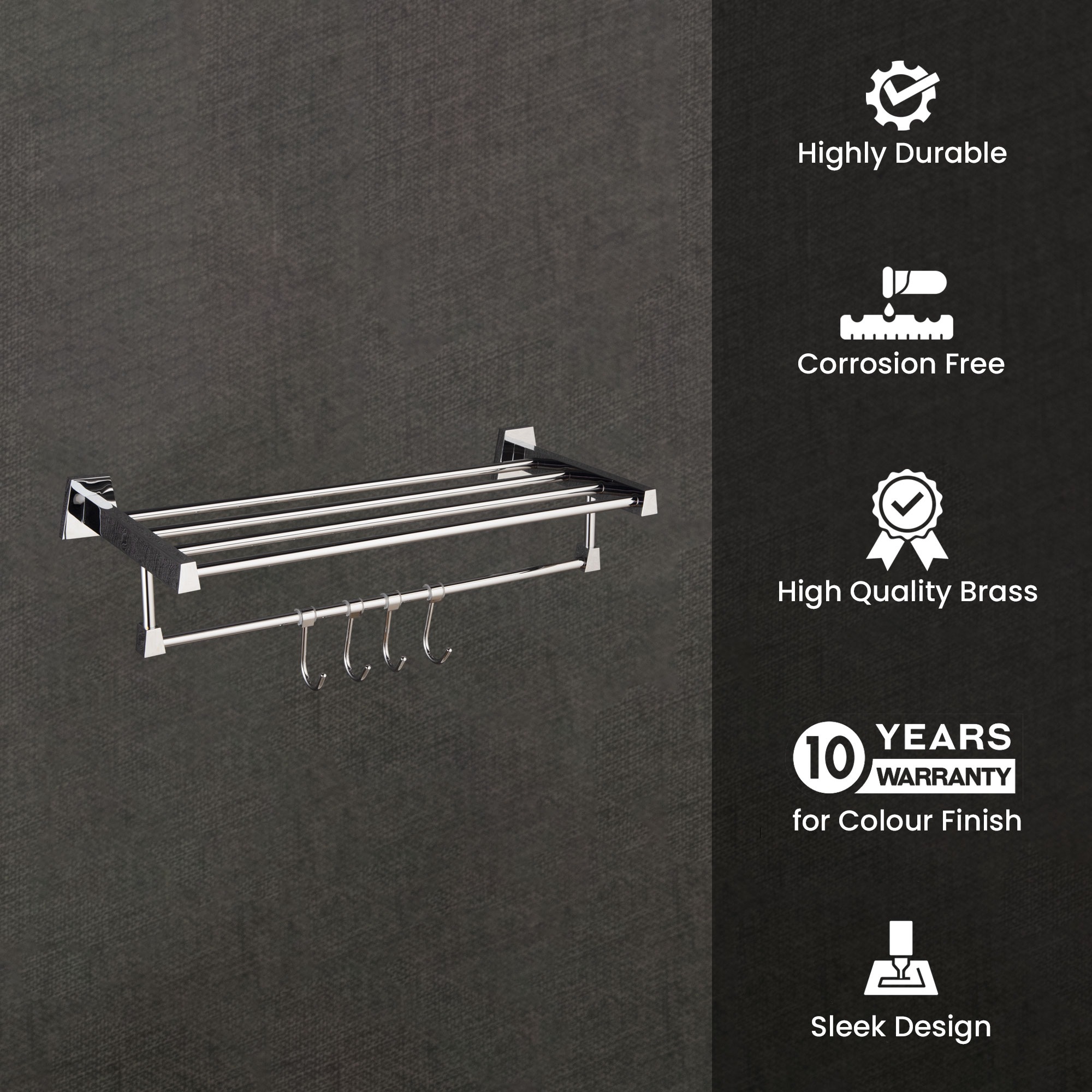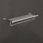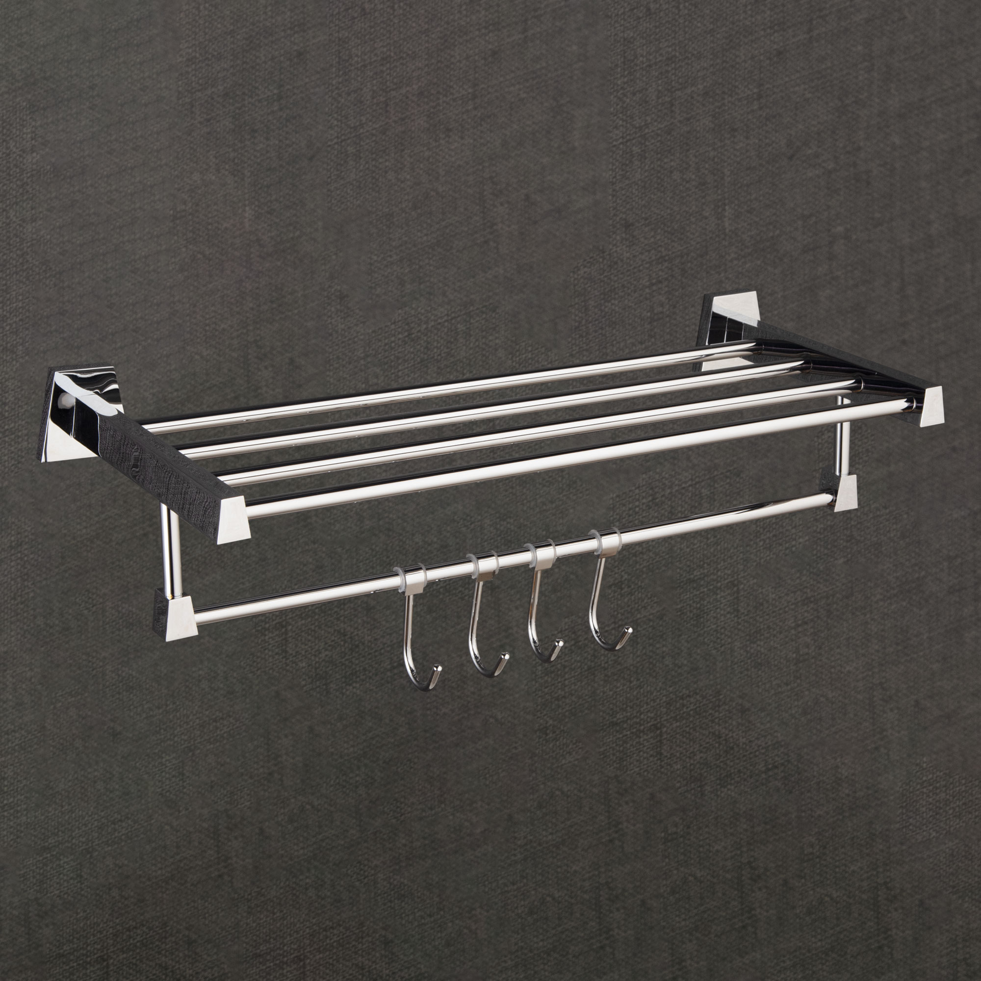 Maximize your bathroom storage with this elegant 24-inch wall-mounted brass towel rack in a polished chrome finish. Designed for efficiency, it features a spacious top shelf for towels, a sturdy towel bar, and multiple hooks for added convenience. Its corrosion-resistant build ensures durability while complementing modern and classic bathroom aesthetics.