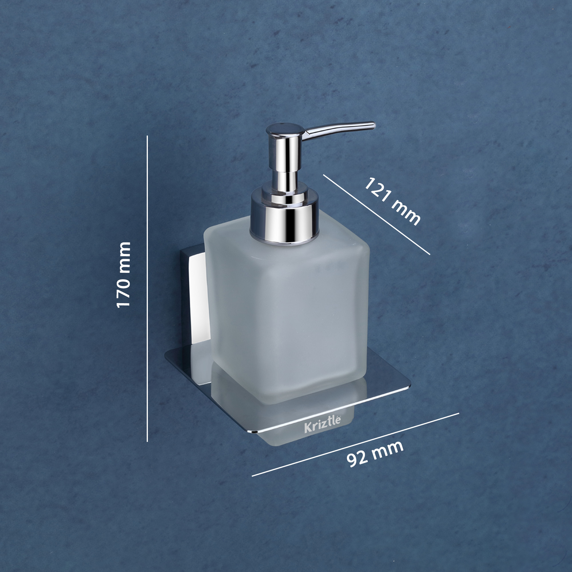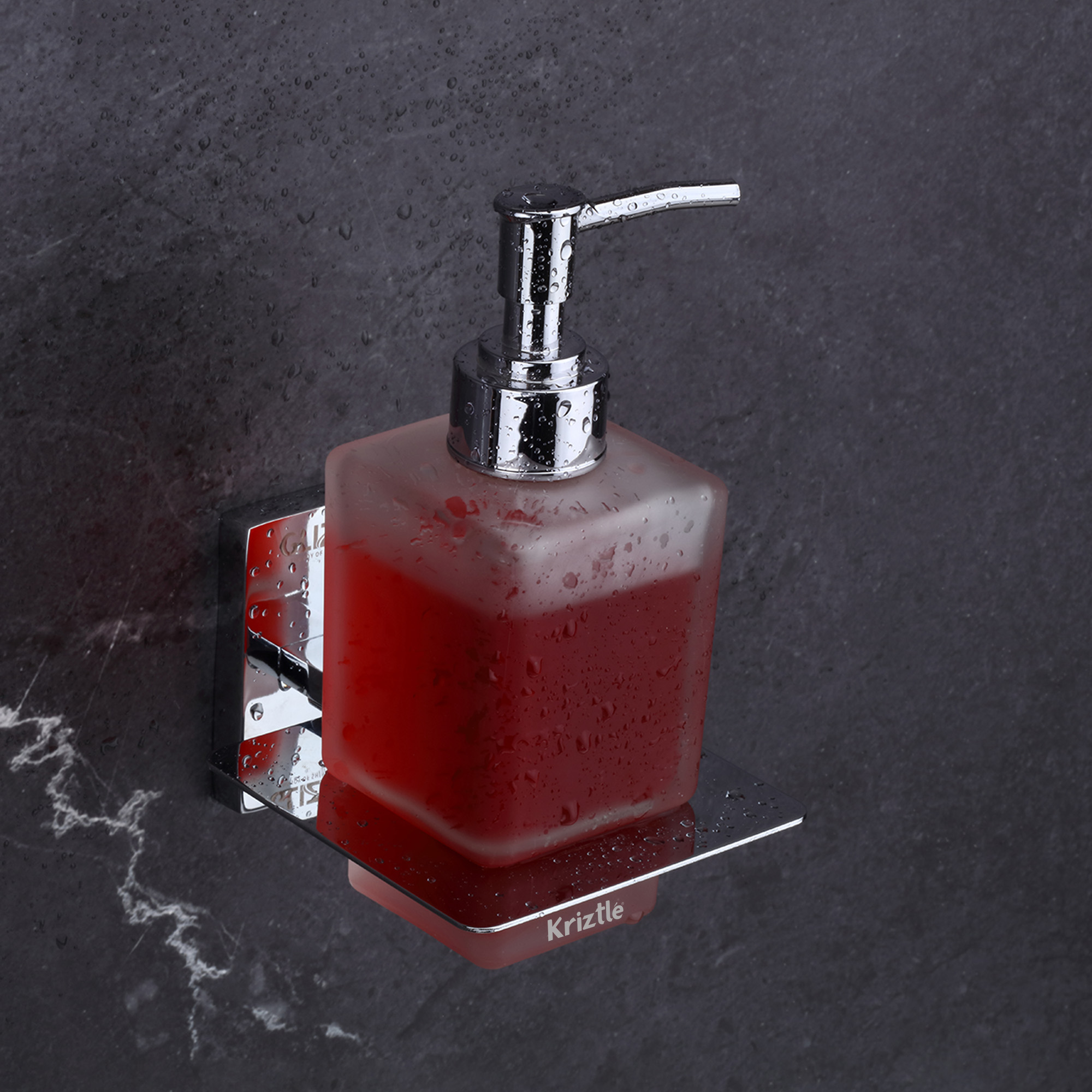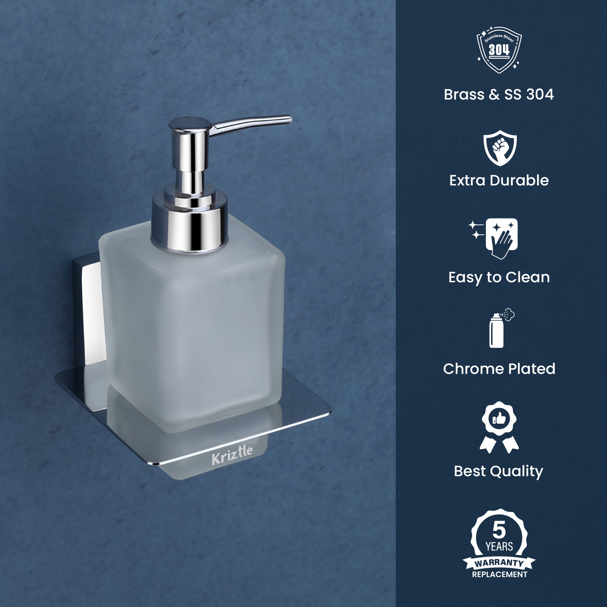 The Kriztle PR-407 Wall Mounted Liquid Soap Dispenser is a stylish and durable bathroom accessory made with Brass & SS 304 and a frosted glass container. With a premium chrome finish, it offers both elegance and practicality for modern bathrooms.